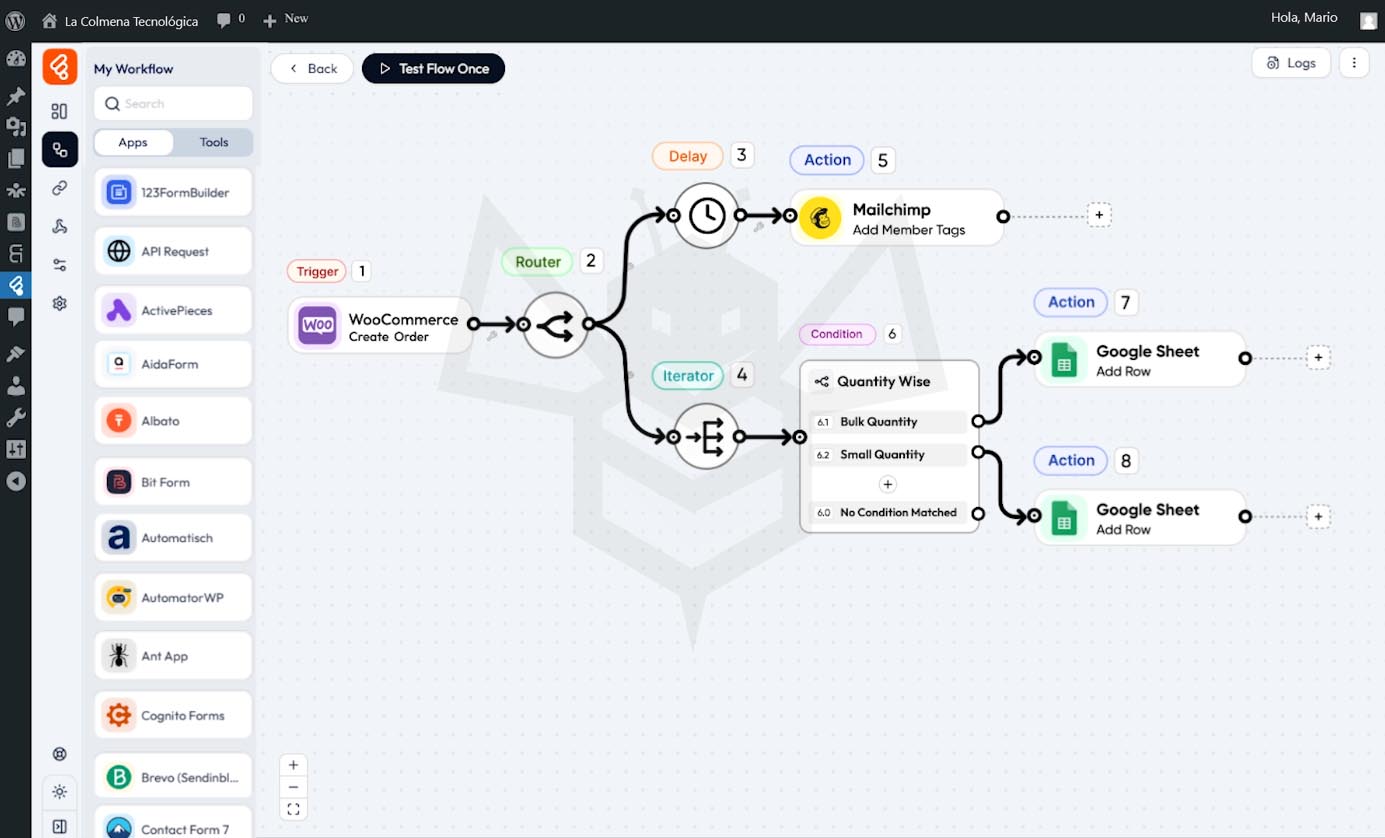 Bit Flows es un plugin de WordPress que permite crear flujos de trabajo avanzados de forma visual y sin necesidad de programar. Funciona como un sistema de automatización integrado, similar a herramientas externas como Zapier o Make, pero directamente en tu web, con mayor control de datos y sin limitaciones por uso.